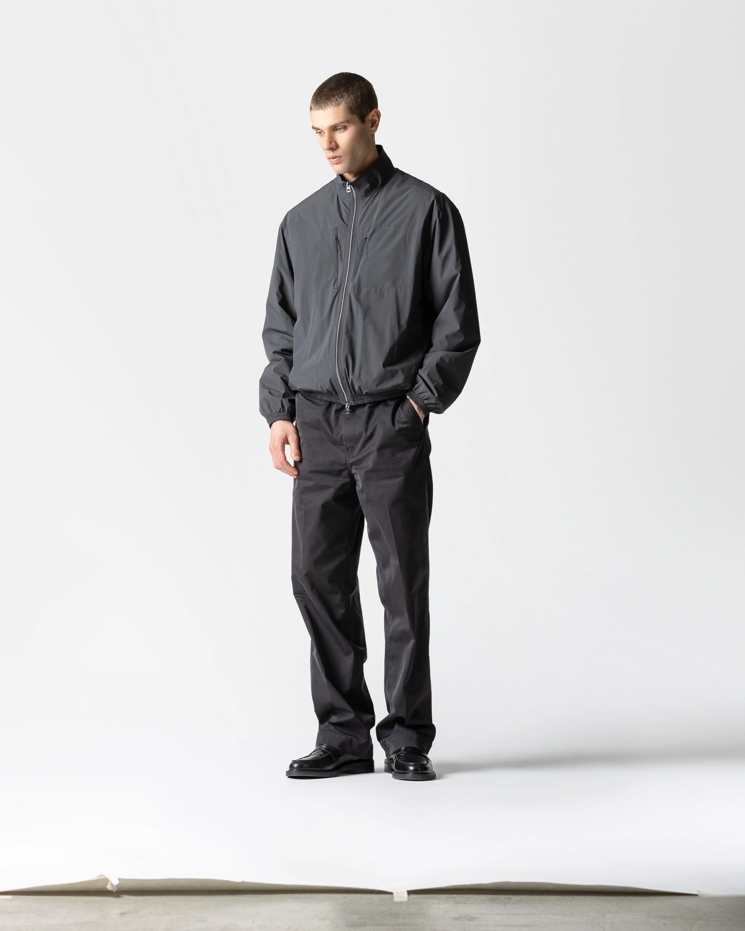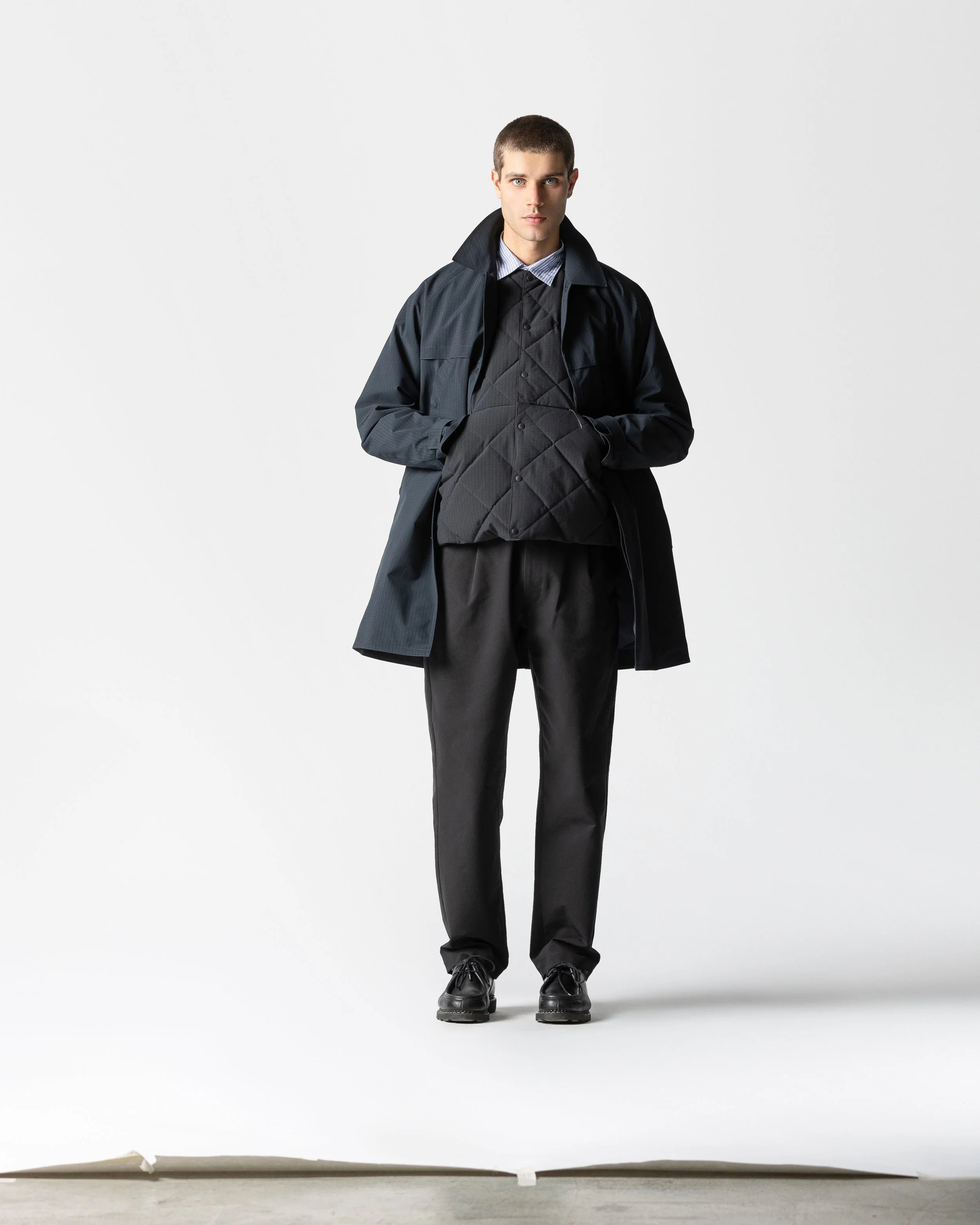 A man walking up stairs with metal railing, wearing a black coat from ADHOCONCEPT and gray pants, against a dark wall background.