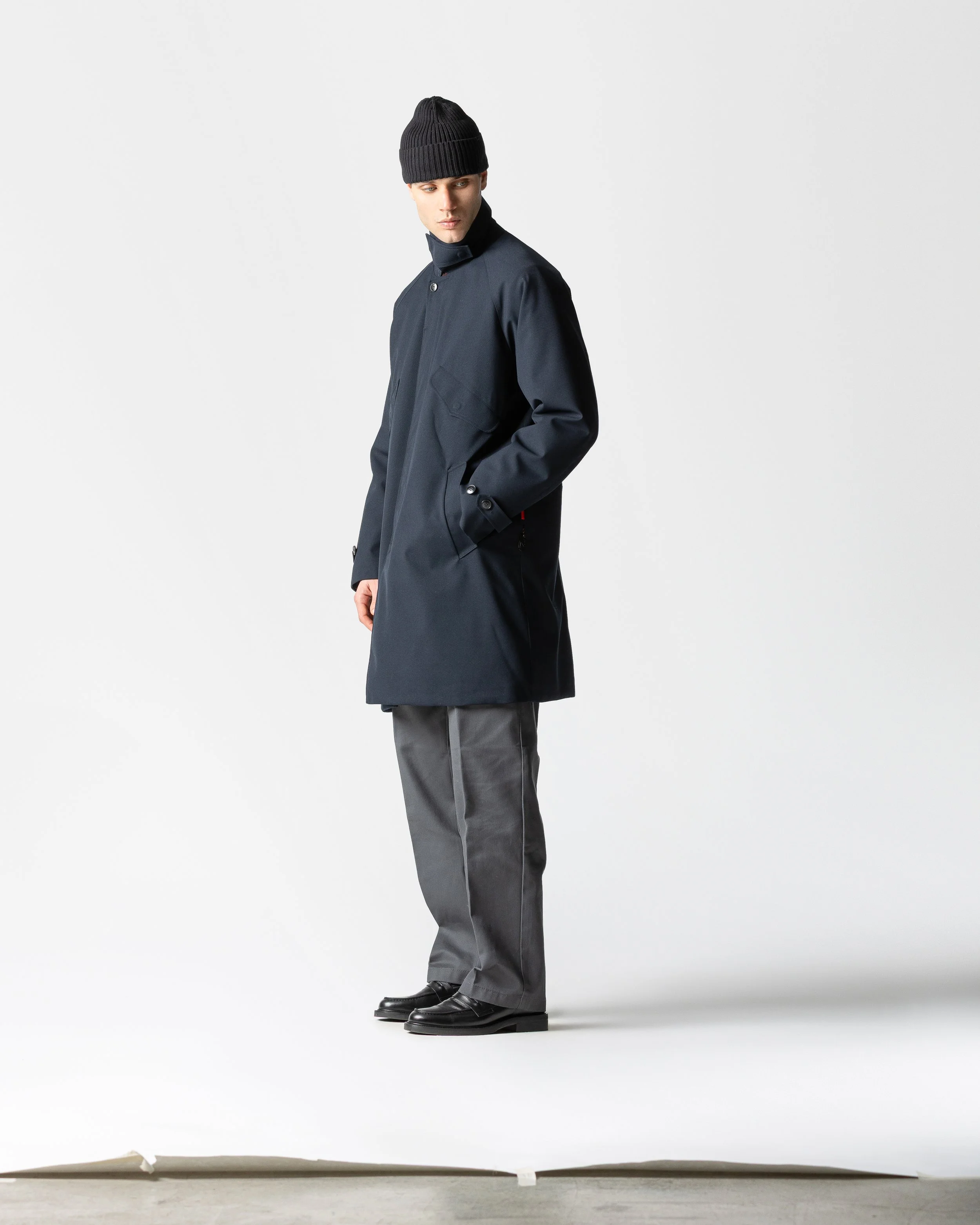 Young man standing against a brown horizontal wooden wall, wearing a navy long coat from ADHOCONCEPT and jeans, with a car in the foreground.